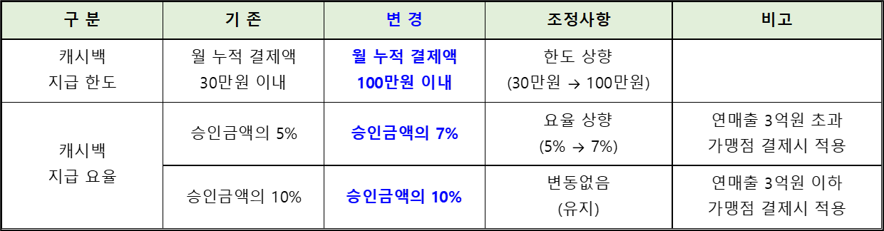 3. 기타 유의 사항 1) 월 누적 결제액의 합산은 카드가 아닌 회원 계정당 통합한도 입니다. ※ 회원 1명이 여러 장의 카드를 사용시, 여러 장의 사용금액이 합산됩니다. 2) 월 누적 결제액 산정 기준은 매월 1일 00:00 ~ 매월 말일 23:59까지 결제분입니다. 3) 연매출 3억원 이하 가맹점에서 결제시 지급되는 캐시백 10%는 변동사항이 없습니다. 4) 충전금으로 결제한 금액만 캐시백이 지급되며, 캐시(포인트)나 정책지원금으로 결제한 금액은 캐시백이 지급되지 않습니다. 5) 인천사랑상품권은 인천 전 지역에서 사용할 수 있습니다. (단, 일부 제한 업종 및 지역사랑상품권 법령 개정에 따른 미등록 가맹점은 결제 불가)