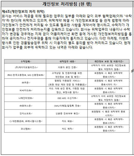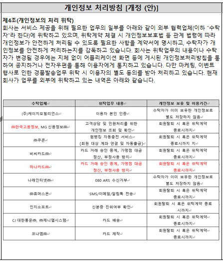 1. 개인정보 처리 수탁업체 현행화 1) 매입 대행사 변경에 따른 수탁업체 현행화 -. 하나카드(주) 추가 2) 수탁업체명 변경 -. (주)KS한국고용정보 → (주)한국고용정보